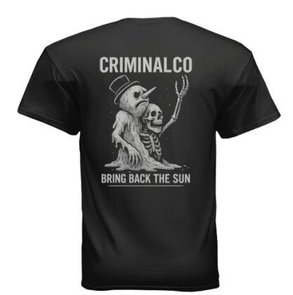 Featuring our winter-worn skeleton melting into the snowfall, this design blends vintage tattoo shading, distressed white tones, and bold icy highlights that pop on a black tee. It’s symbolic, gritty, and unapologetically CriminalCo.